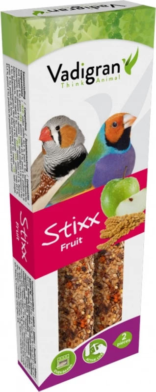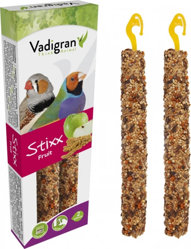 Les baguettes Vadigran StiXX pour oiseau exotique fruit 85gr sont des aliments complémentaires sains et délicieux pour vos oiseaux. Les StiXX Vadigran sont des friandises naturelles cuites au four telles des pâtisseries et sont composées de divers ingrédients enrobés d’un délicieux biscuit.