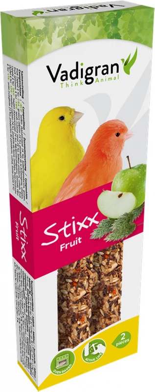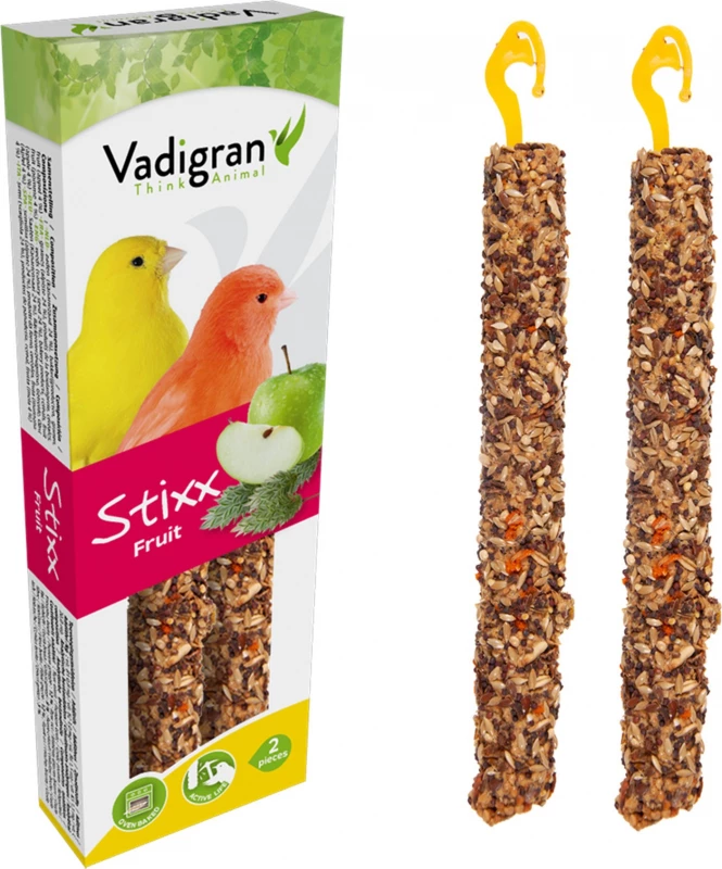 Les baguettes Vadigran StiXX pour canari fruit 85g sont des aliments complémentaires sains et délicieux pour vos oiseaux. Les StiXX Vadigran sont des friandises naturelles cuites au four telles des pâtisseries et sont composées de divers ingrédients enrobés d’un délicieux biscuit.