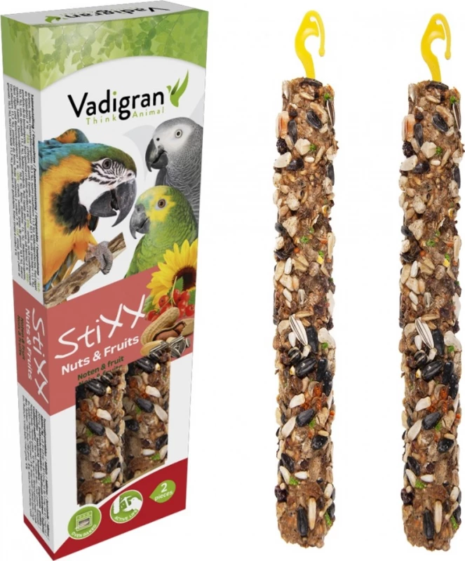 Les baguettes à ronger Vadigran StiXX pour Maxi perroquet 150gr sont des friandises saines et délicieuces pour vos oiseaux. Les StiXX Vadigran sont des friandises naturelles cuites au four telles des pâtisseries et sont composées de divers ingrédients enrobés d’un délicieux biscuit. Facile à clipser à votre cage grâce à son attache en plastic, ils possèdent un coeur en bois naturel que vos oiseaux pourront picorer autant qu’ils le veulent en toute sécurité. Ils sont également idéaux pour l’usure naturelle du bec. Disposez toujours un stiXX dans la cage pour que votre oiseau de compagnie puisse profiter d’une vie active. Sans sucres àjoutés, ni colorants ni conservateur, ces délicieuses friandises au four feront le bonheur de vos petits gourmands.