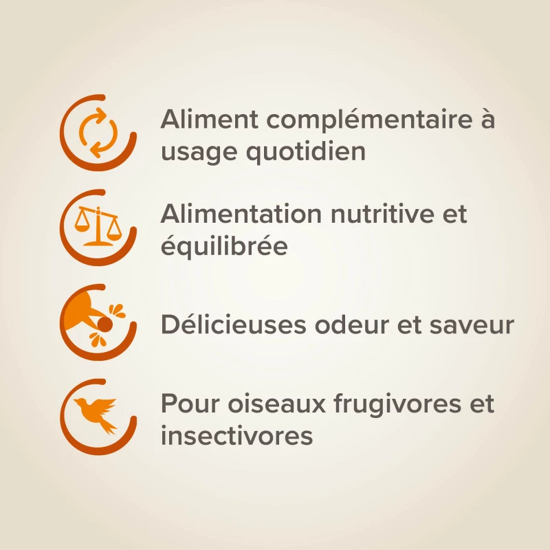 Donnez quotidiennement cette pâtée universelle selon les besoins de l’oiseau.