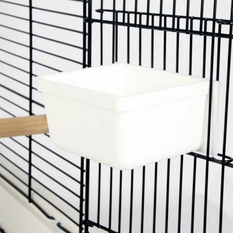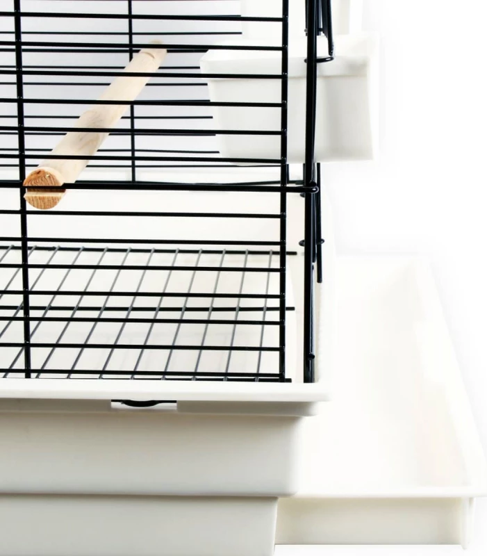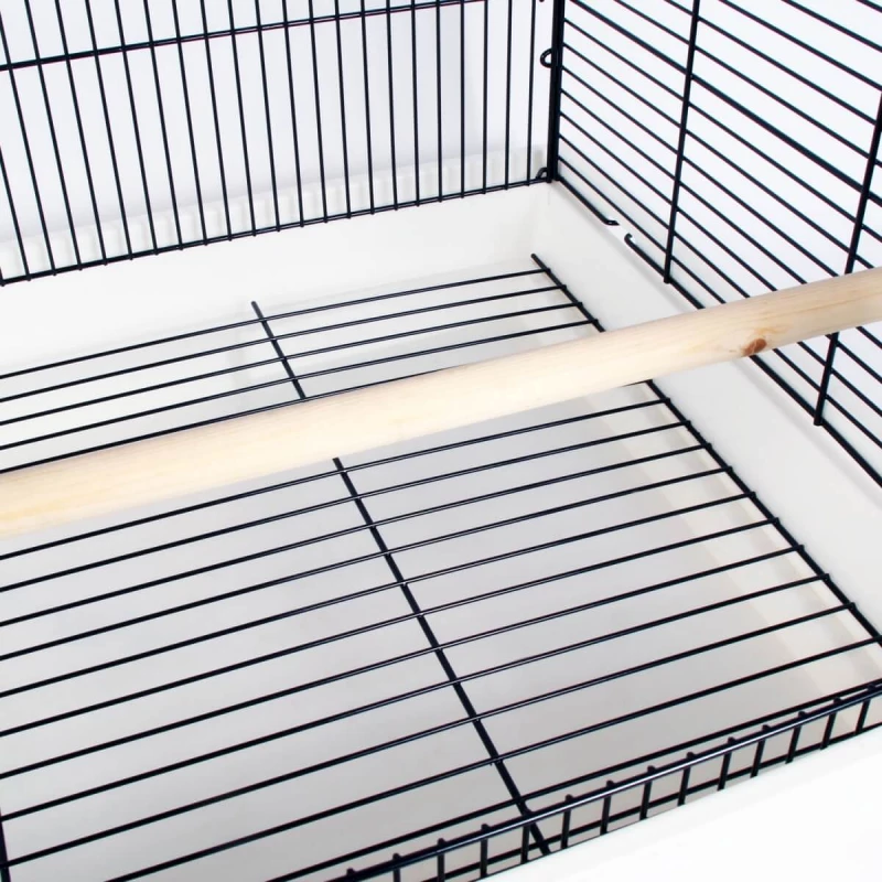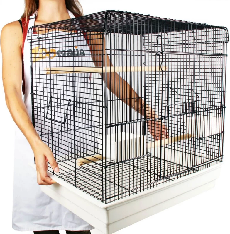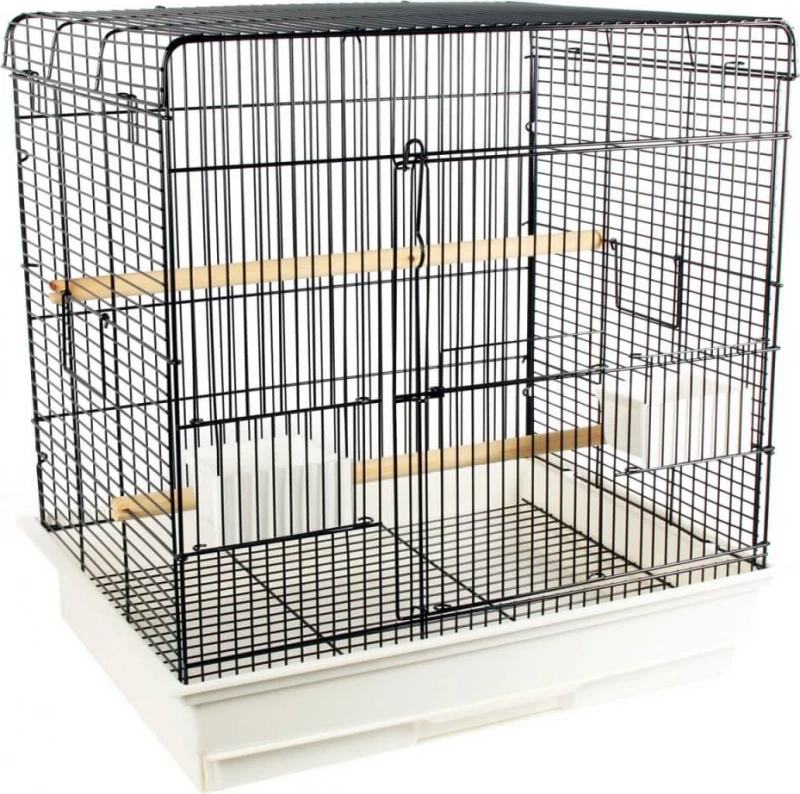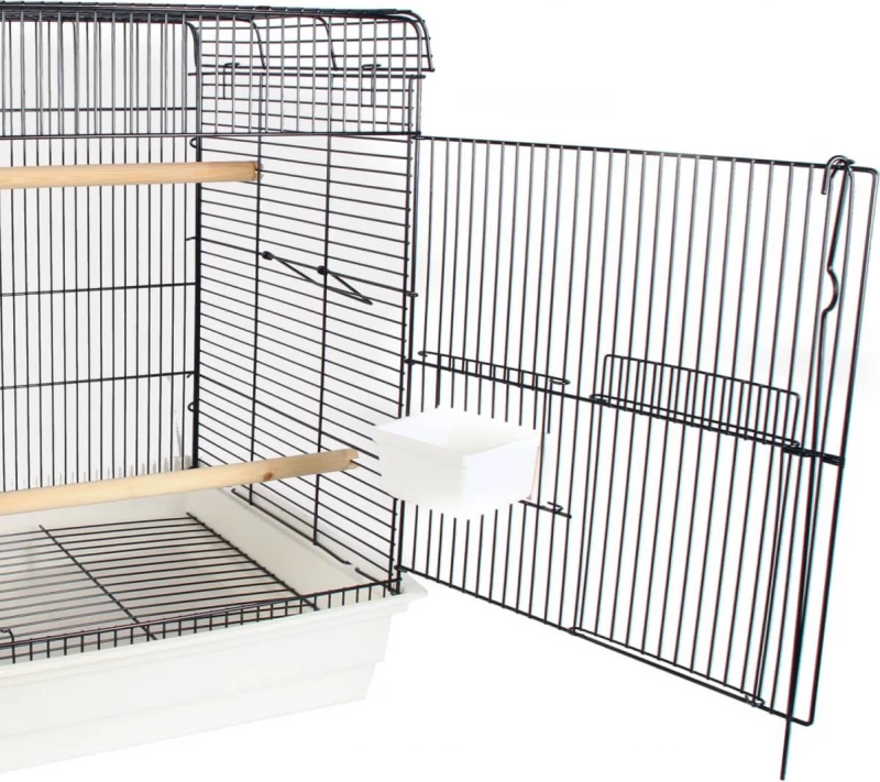 Elle est facile à nettoyer grâce à son tiroir amovible et comporte deux ouvertures dont une large porte donnant un accès à l’ensemble de la cage. Les poignées latérales en métal permettent de la transporter facilement dès que nécessaire. Spacieuse, elle dispose de grands perchoirs et de mangeoires faciles à alimenter de l’extérieur.