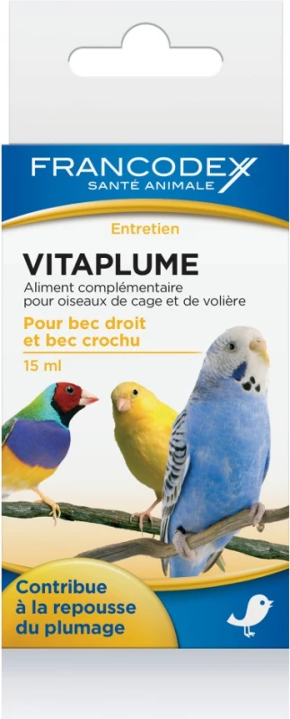 Vitaplume est un complément alimentaire pour oiseaux de cage et de volière. Il convient aux oiseaux à bec droit ou crochu et permet de garder un plumage en pleine forme. Après une mue ou une période de stress, il apporte les acides aminés et les vitamines indispensables à la repousse harmonieuse du plumage, tout en évitant la fatigue de votre oiseau.