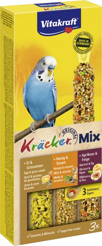 Ces Friandises croustillantes riches en miel et sésame/oeuf et graines de graminées/ abricot et figue sont spécialement adaptées aux besoins des perruches.