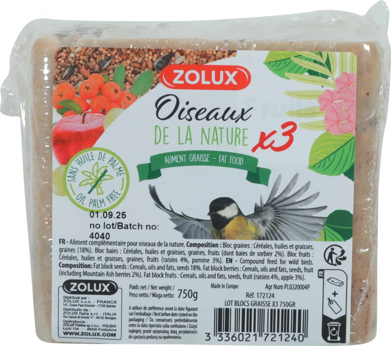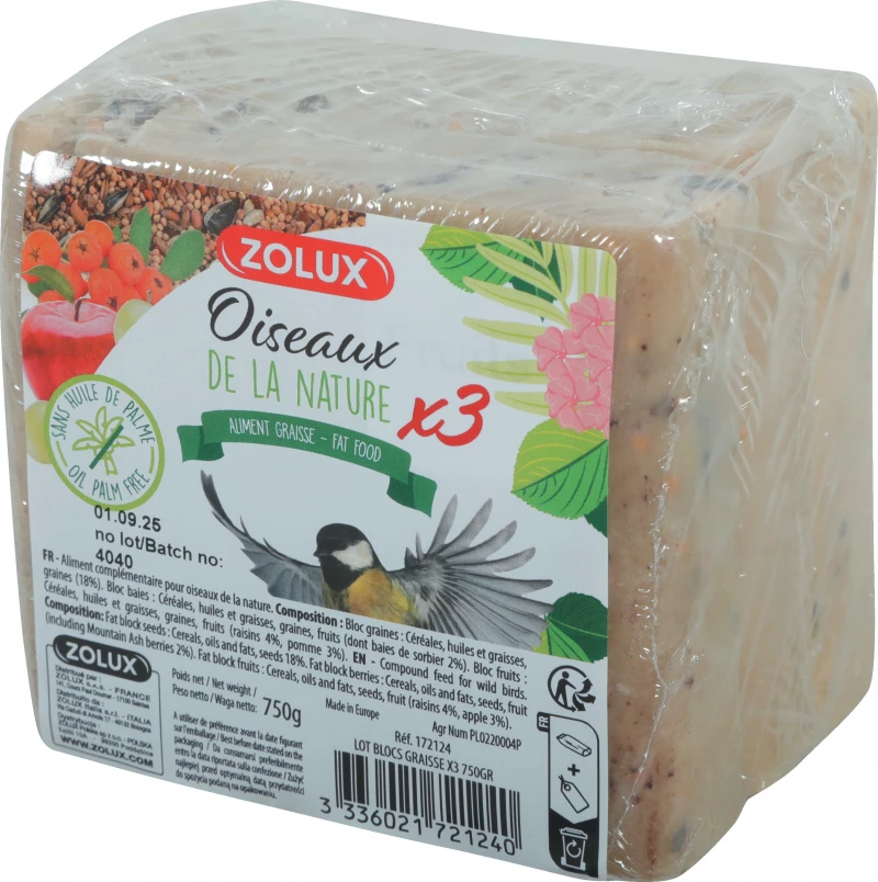 Le lot de 3 pains de graisse – graines, baies et fruits fournira tous les besoins en nutriments essentiels aux bon développement des oiseaux du jardin. Elles ce places facilement dans votre jardin.