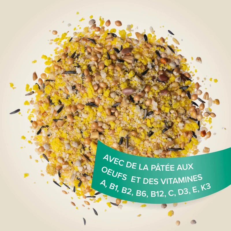 La recette se compose avec de la pâtée aux œufs de haute qualité et d’un mélange de graines pour répondre aux besoins nutritionnels de vos oiseaux.