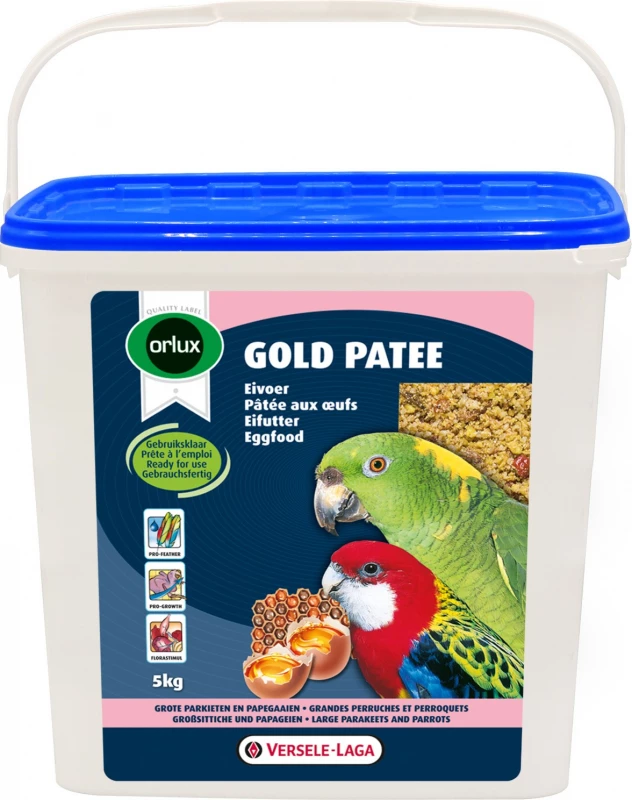 Orlux Gold pâtée grandes perruches & perroquets sont des compléments alimentaires en pâtée aux oeufs prête à l’emploi pour toutes les grandes perruches, perroquets, cacatoès et aras. C’est aussi une friandise appréciée par les oiseaux de compagnie. L’ajout de miel 100 % naturel donne à cet aliment une valeur nutritive plus élevée. La lysine et méthionine ajoutées en extra garantissent une croissance et édification des plumes optimales. Gold patee perruches + perroquets est enrichie de : insectes séchés, crevettes séchées, baies d’églantier, baies de sorbier et raisins secs.