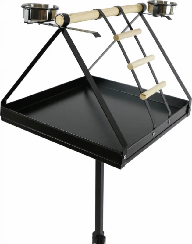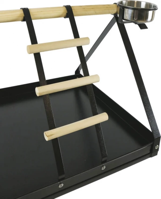 Offrez à votre perroquet un perchoir stable et élégant. Le perchoir PICOLO est fabriqué en en fer forgé pour assurer sa robustesse et comporte un perchoir en bois ainsi qu’une échelle en bois et métal. Livré avec deux gamelles en inox amovible, cet accessoire pour oiseaux est pratique et raffiné avec son pied décoré.