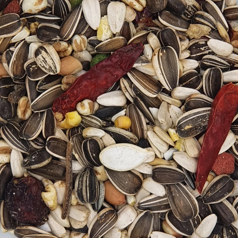 Ce mélange, dédié aux grandes espèces à fort besoins en lipides contient aussi des grosses noix comme des noisettes, des noix de pécan et des noix de Grenoble.