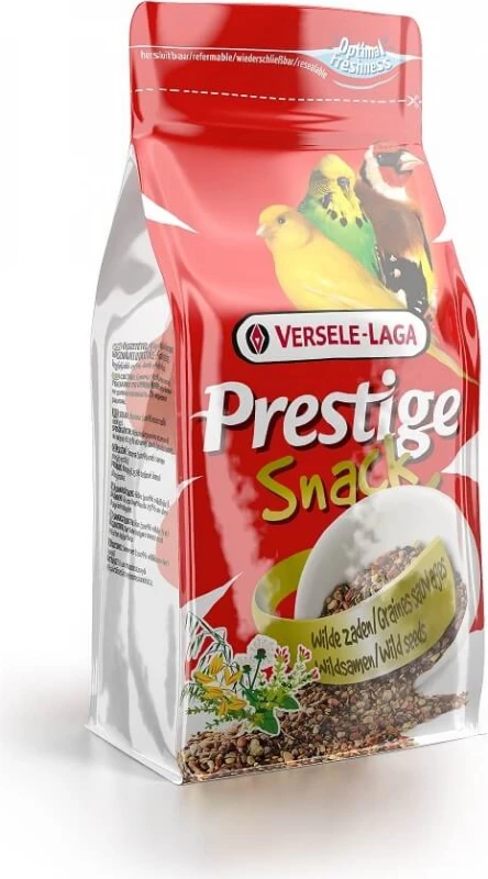 Prestige Snacks Graines sauvages de Versele Laga est un mélange de délicieuses graines prélevées directement dans la nature. A distribuer en complément de la ration de nourriture habituelle, vos oiseaux vont raffoler de ce mélange composé de plus de 30 graines différentes de plantes, graminées et autres légumes. Cet aliment contribue à répondre aux besoins nutritifs de vos oiseaux pour les garder en bonne santé.